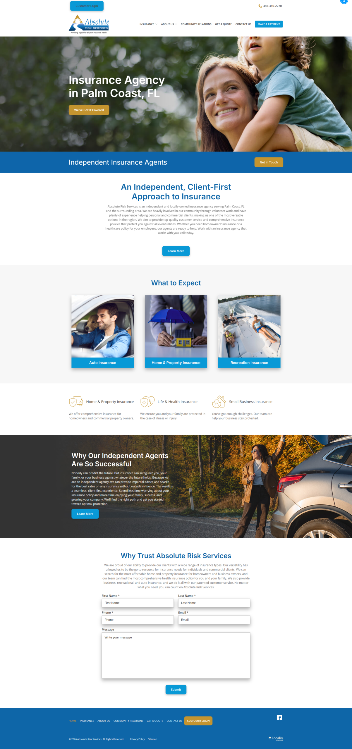 Absolute Risk Services is a locally-owned and independent insurance agency proudly serving Palm Coast, Florida and the surrounding communities. With a strong commitment to community involvement and a client-first philosophy, Absolute Risk Services has established itself as one of the region’s most trusted and versatile insurance providers.